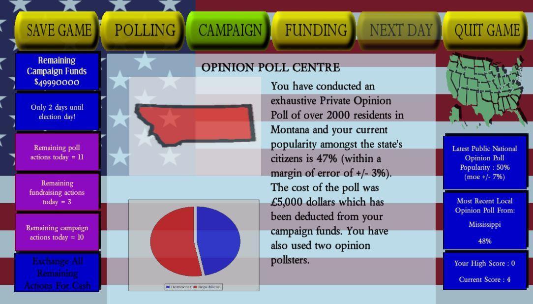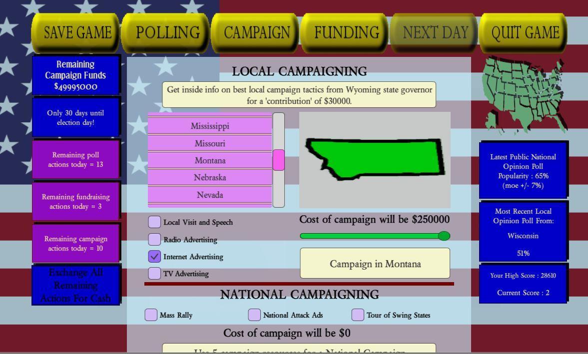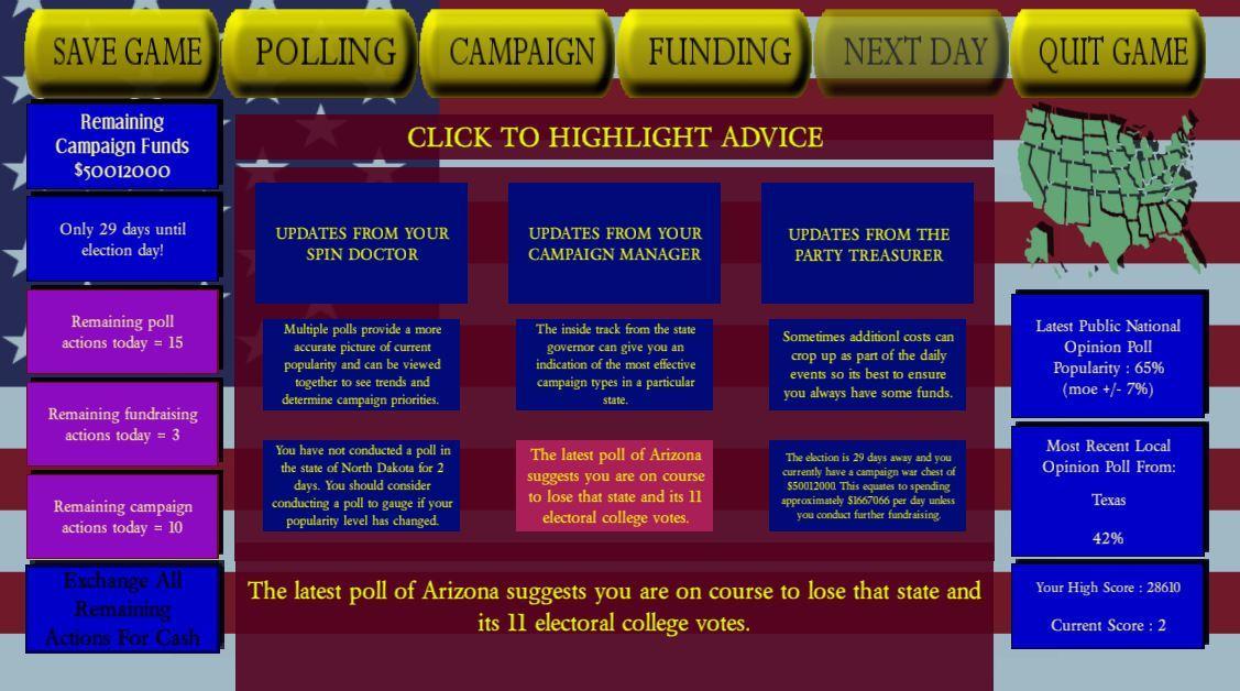 筹集资金,进行民意测验,从当地州长那里获得内幕运动信息,针对您的当地和国家竞选活动,并在参加选举的路上对日常活动做出反应。在比赛紧迫的选举中,使用法律上诉诉讼胜利。但是请注意,即使您的对手也将一无所有,即使是自己的诉讼和诉讼,以使您的竞选活动脱轨。