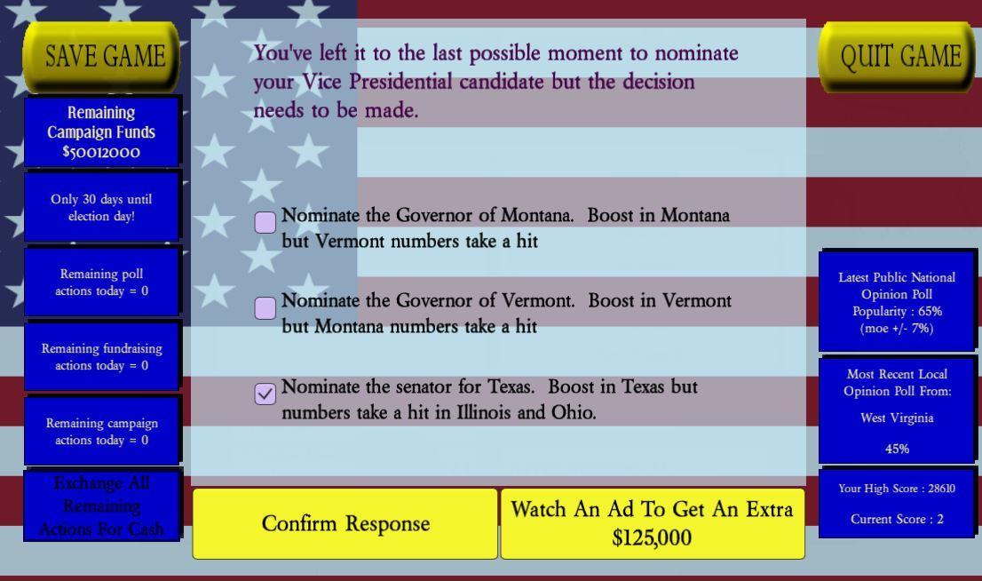 选择观看广告以获取额外的竞选资金,并随着您的进步,请查看您可以赢得多少州,改善您赢得的众议院和参议院席位的数量,以获取下一个竞选活动,取消成就并瞄准高分并成为终身总统。